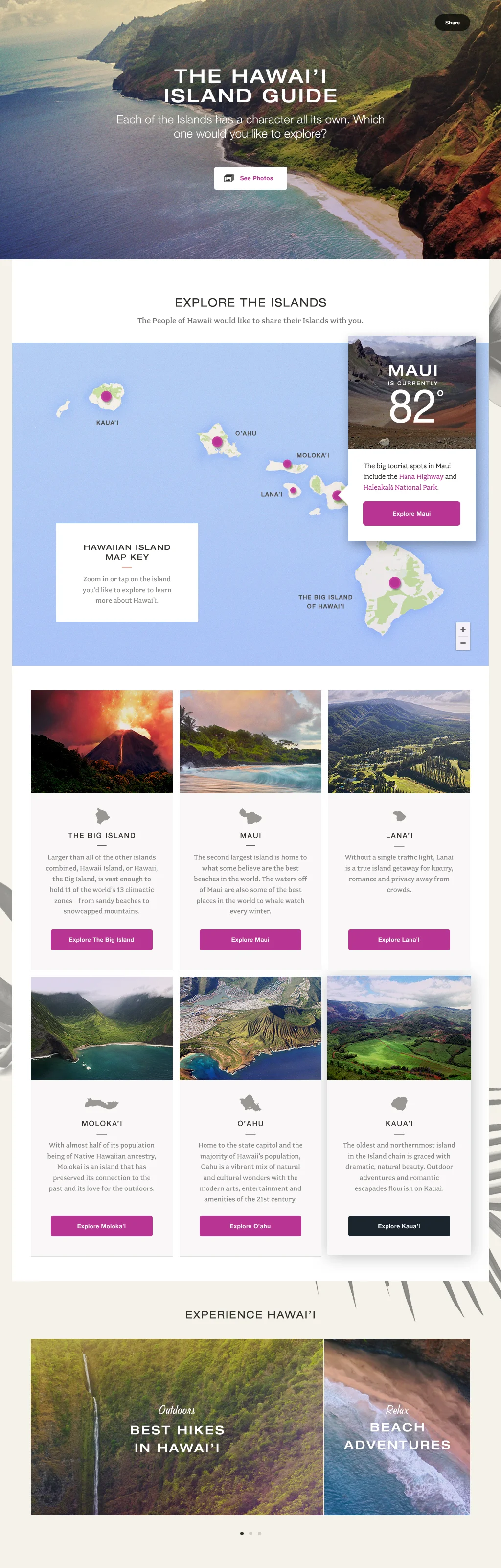 We created an Island Guide for visitors to gain a sense of Hawaii's magic. Visitors can explore the sites and activities of individual islands, gathering ideas as they plan their adventures.